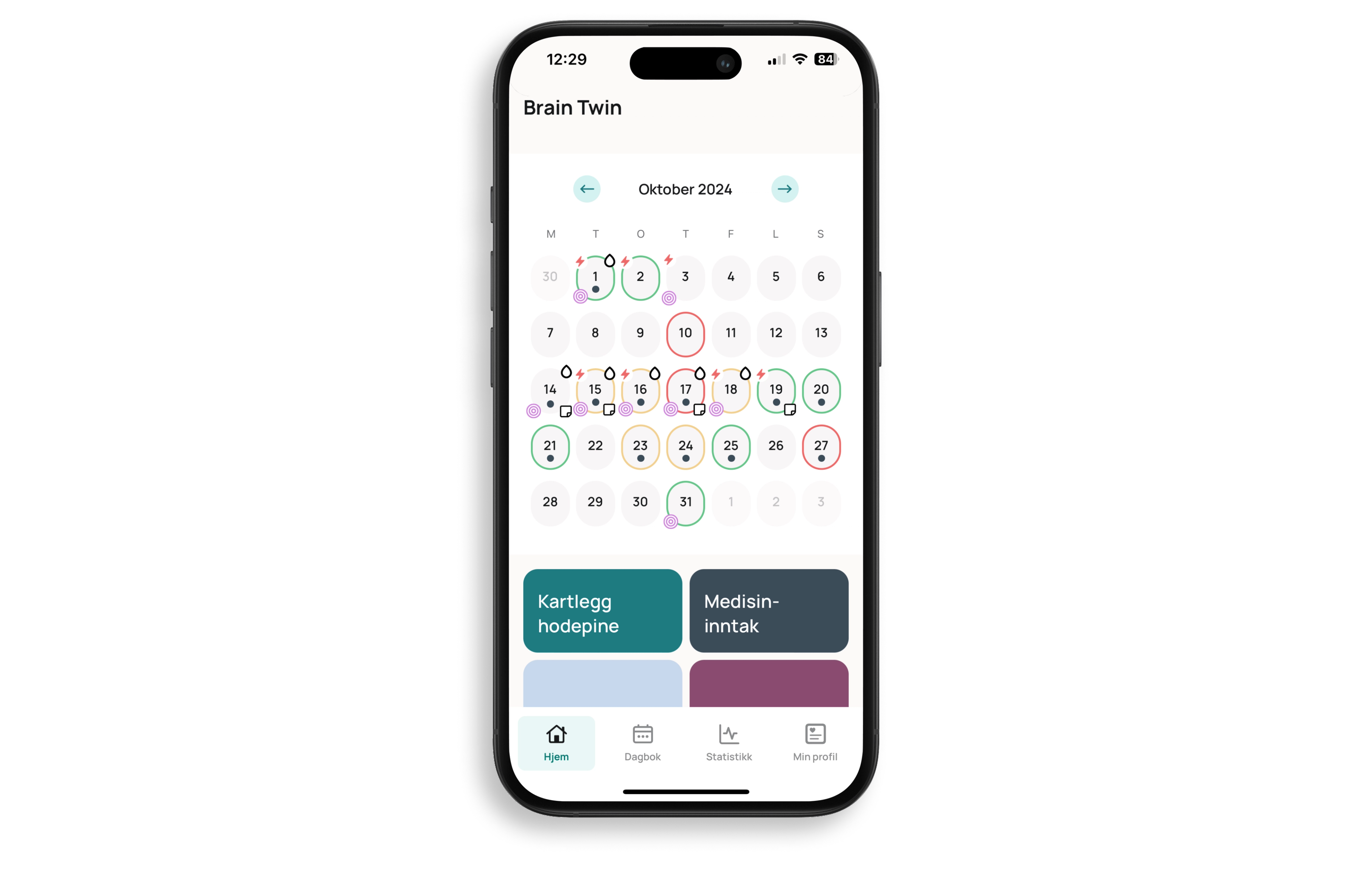 Via kalenderen er det lett for deg å skille mellom migrene- og hodepinedager, dager du har hatt aura, og dager med forskjellig intensitet. Bli bedre kjent med deg selv og finn mønstre slik at du kan forbedre behandlingen din. Med Brain Twin Premium får du blant annet tilgang til å loggføre symptomer, sammen med unik innsikt og statistikk.