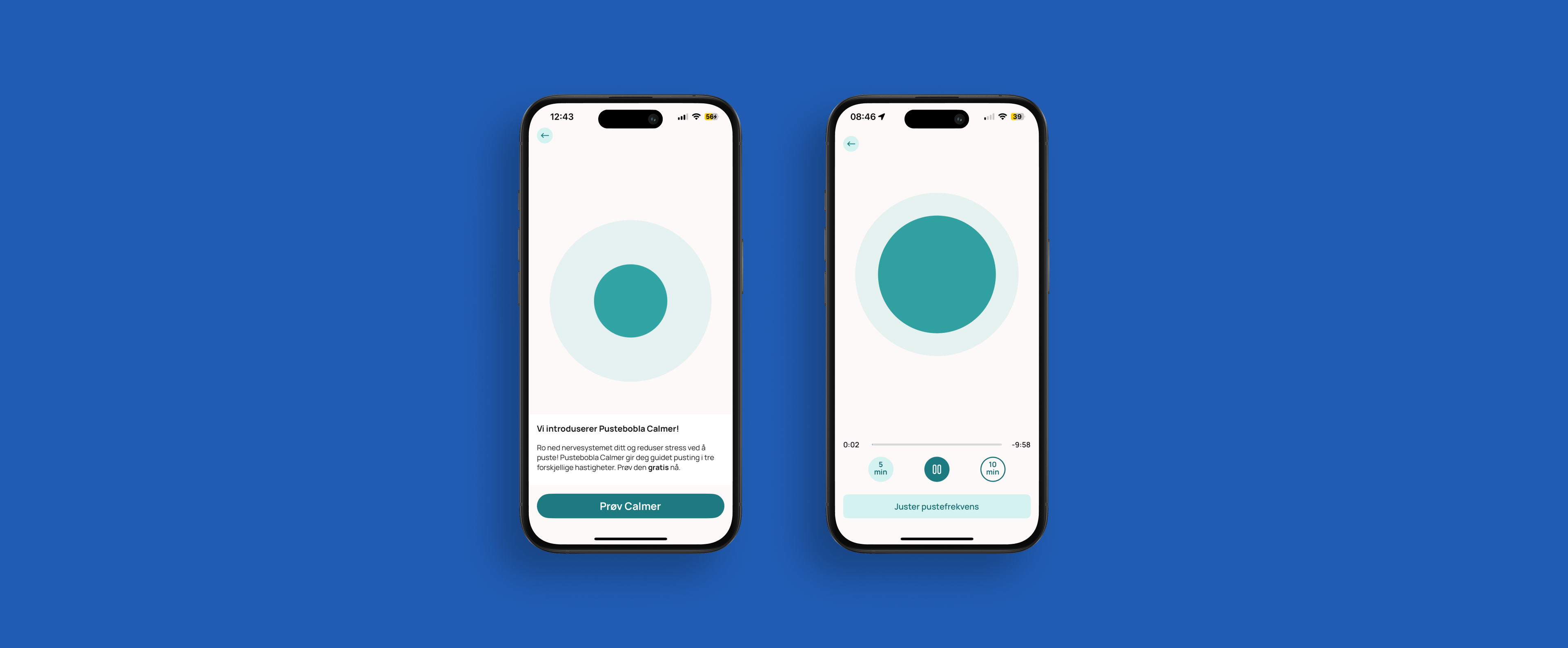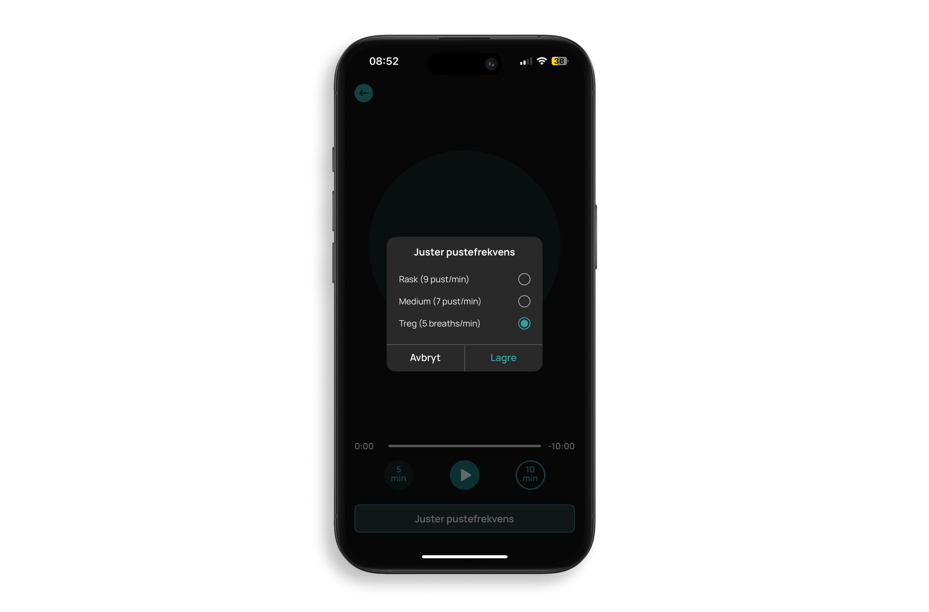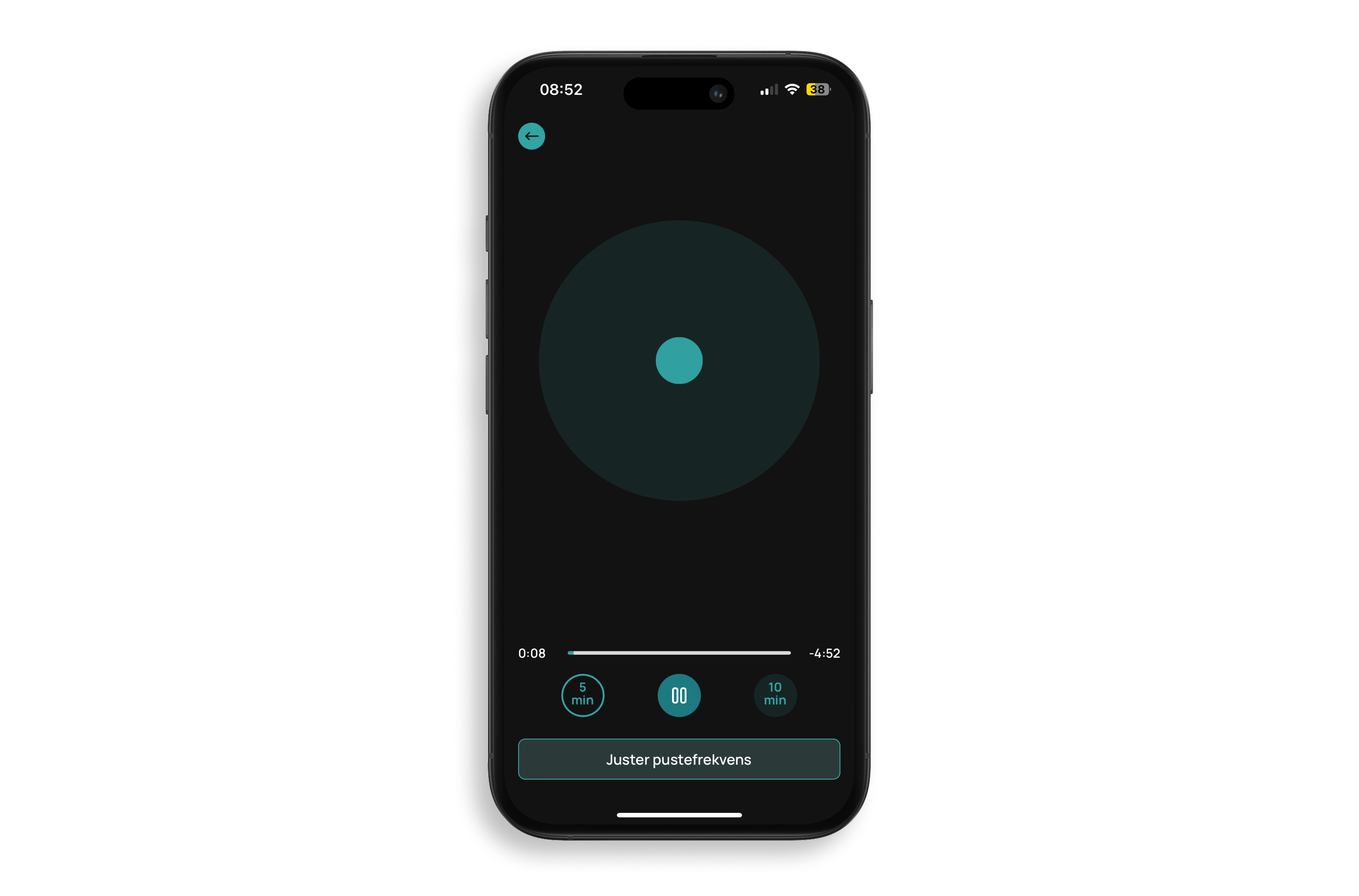 Sett telefonen på stille og finn en behagelig sittestilling. Åpne Brain Twin-appen og trykk på Pusteguide på forsiden. Velg om du vil puste i 5 eller 10 minutter, og hvilket tempo som passer best – rolig, middels eller litt raskere. En sirkel på skjermen utvider og trekker seg sammen for å hjelpe deg å holde rytmen: pust inn når sirkelen vokser, og pust ut når den trekker seg sammen. Økten lagres automatisk, slik at du etter hvert kan se mønstre i statistikken. (Statistikk for pusteguiden er ikke klart ennå.)