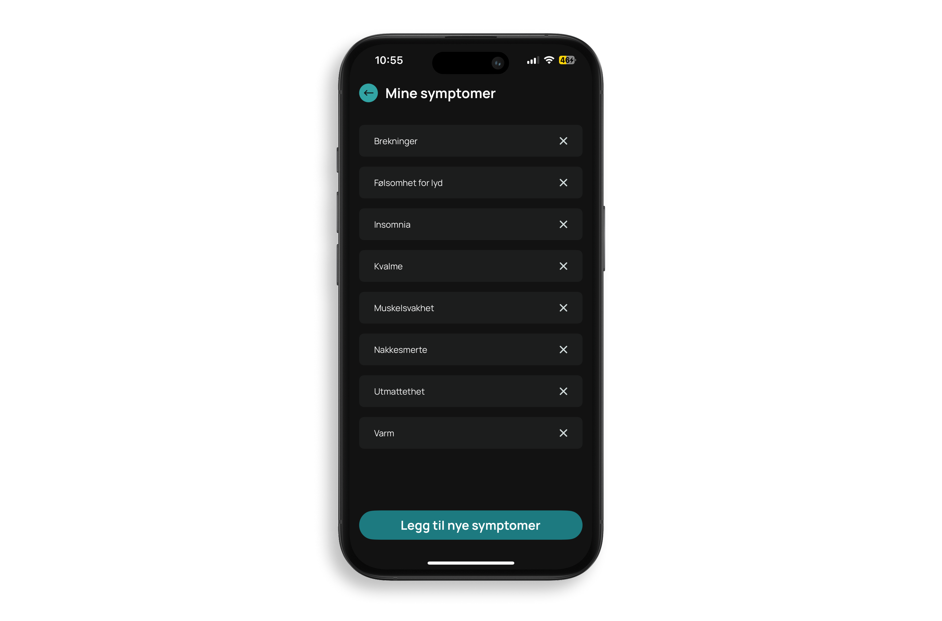 - Rask registrering: legg til et symptom med to trykk etter at du har åpnet appen, rett etter at det oppstår.
